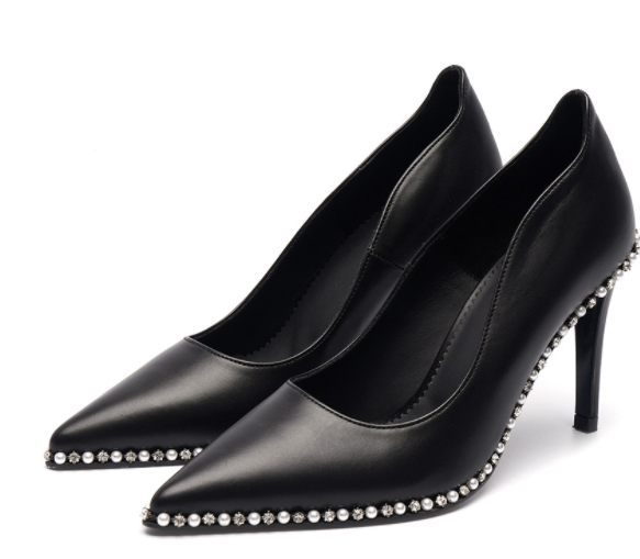 물결 어퍼에 큐빅과 진주 장식으로 페미닌한 무드가 돋보이는 드레시한 구두입니다. 일명 한예슬 구두로 잘 알려져 있습니다. 시크하면서도 고급스러운 무드를 보여줘 오피스룩이나 페미닌룩과 잘 어울릴 것 같습니다.